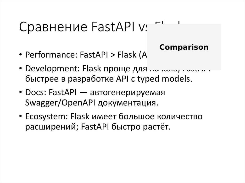 Сравнение FastAPI vs Flask• Performance: FastAPI > Flask (ASGI vs WSGI).