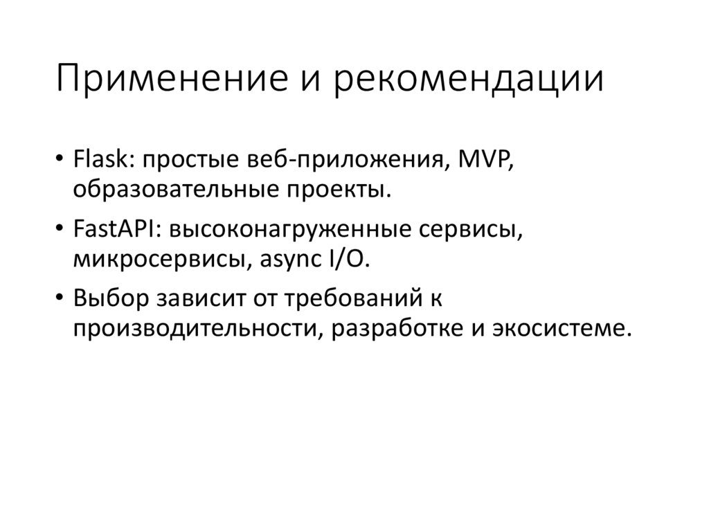 Применение и рекомендации• Flask: простые веб-приложения, MVP,
