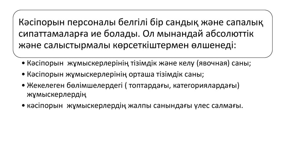Кәсіпорын персоналы белгілі бір сандық және сапалықсипаттамаларға ие болады. Ол мынандай абсолюттік