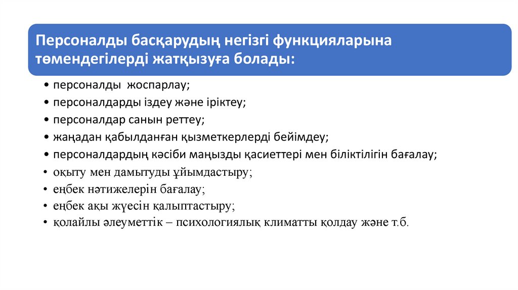 кадр саясатының жалпы қағидаларын әзірлеу, басым мақсаттарды анықтау;персоналға қажеттілікті жоспарлау, кадрлар резервін жасау, құрылымы мен штатан