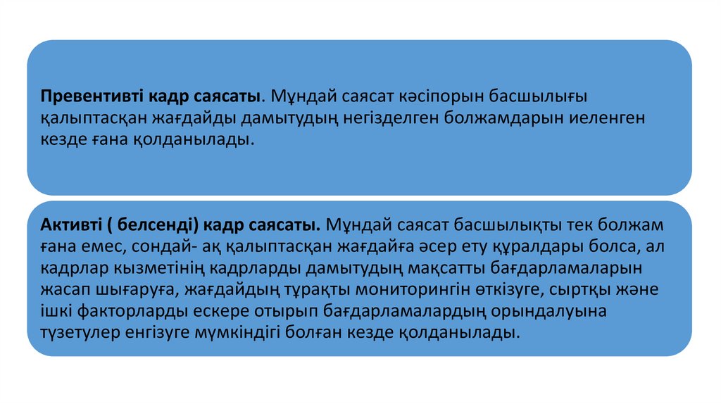 Превентивті кадр саясаты. Мұндай саясат кәсіпорын басшылығықалыптасқан жағдайды дамытудың негізделген болжамдарын иеленген