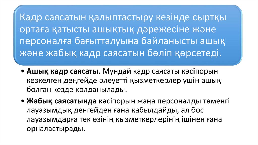 Кадр саясатын қалыптастыру кезінде сыртқыортаға қатысты ашықтық дәрежесіне және