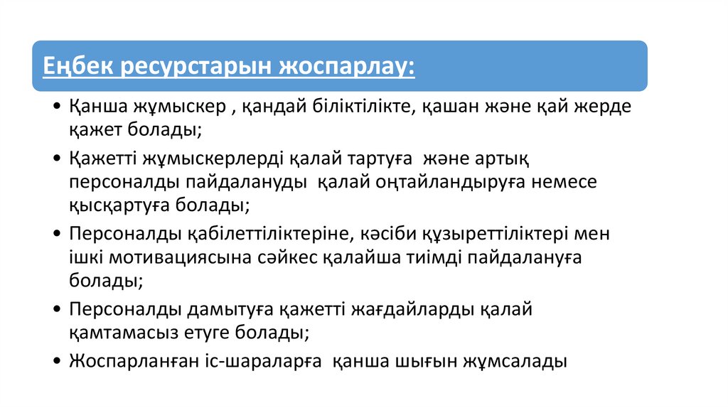 Еңбек ресурстарын жоспарлау:• Қанша жұмыскер , қандай біліктілікте, қашан және қай жерде