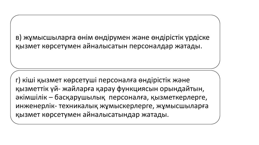 в) жұмысшыларға өнім өндірумен және өндірістік үрдіскеқызмет көрсетумен айналысатын персоналдар жатады.