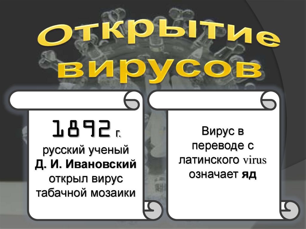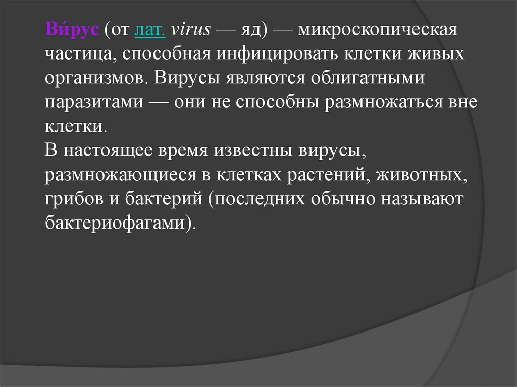 Ви́рус (от лат. virus — яд) — микроскопическаячастица, способная инфицировать клетки живых