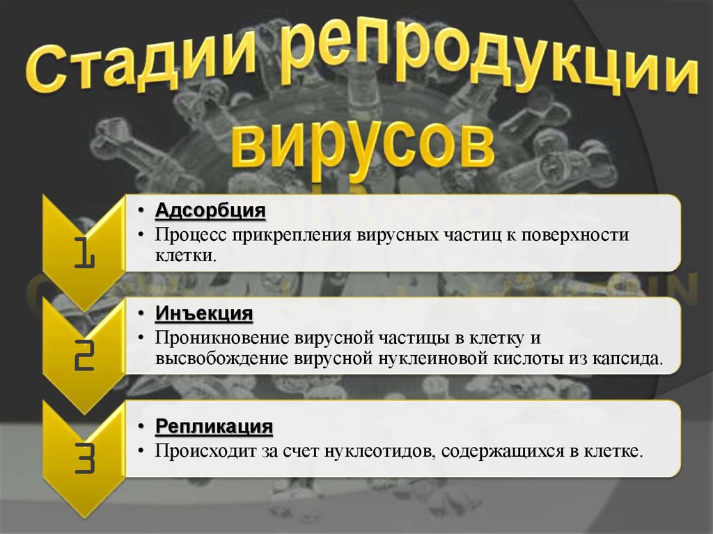 • Процесс прикрепления вирусных частиц к поверхности