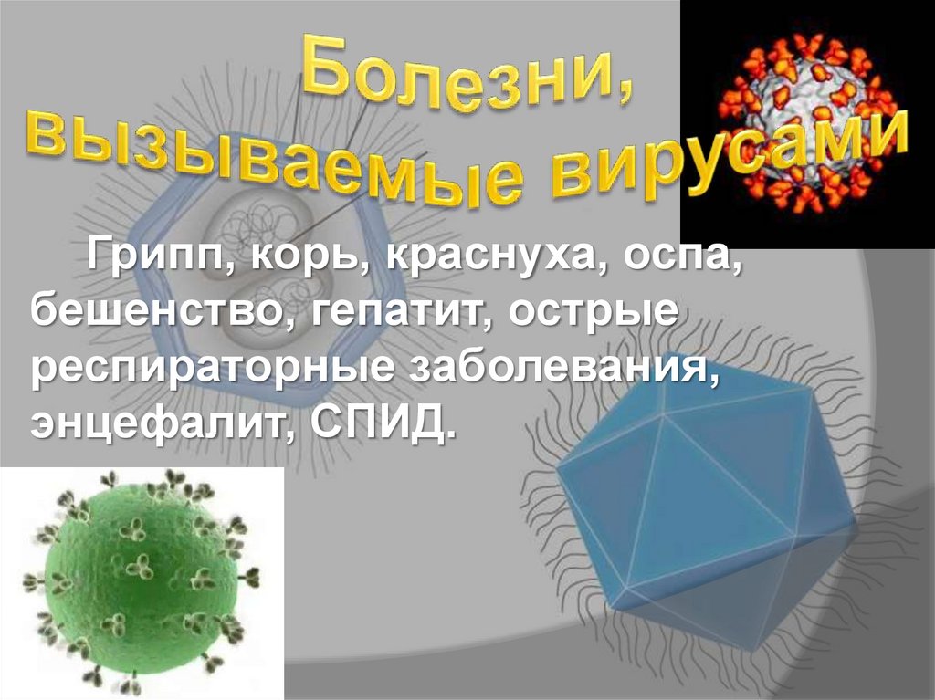 Грипп, корь, краснуха, оспа,бешенство, гепатит, острые