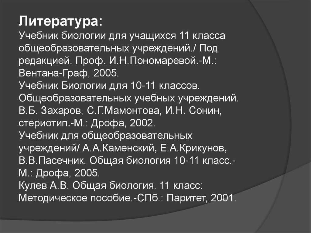 Литература:Учебник биологии для учащихся 11 класса