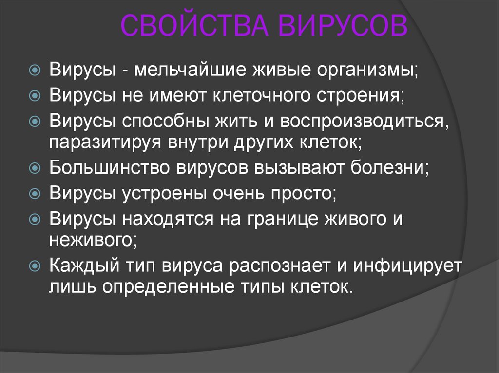 СВОЙСТВА ВИРУСОВВирусы - мельчайшие живые организмы;