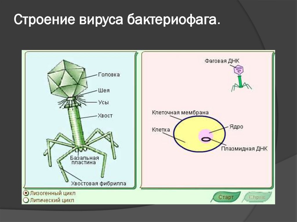Строение вируса бактериофага.9.