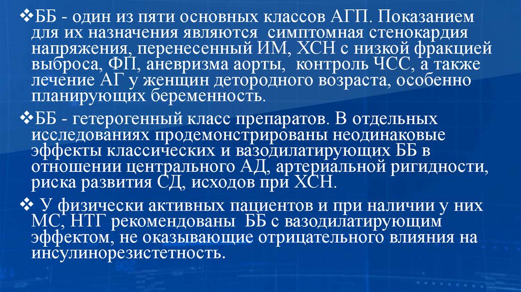 ББ - один из пяти основных классов АГП. Показаниемдля их назначения являются симптомная стенокардия