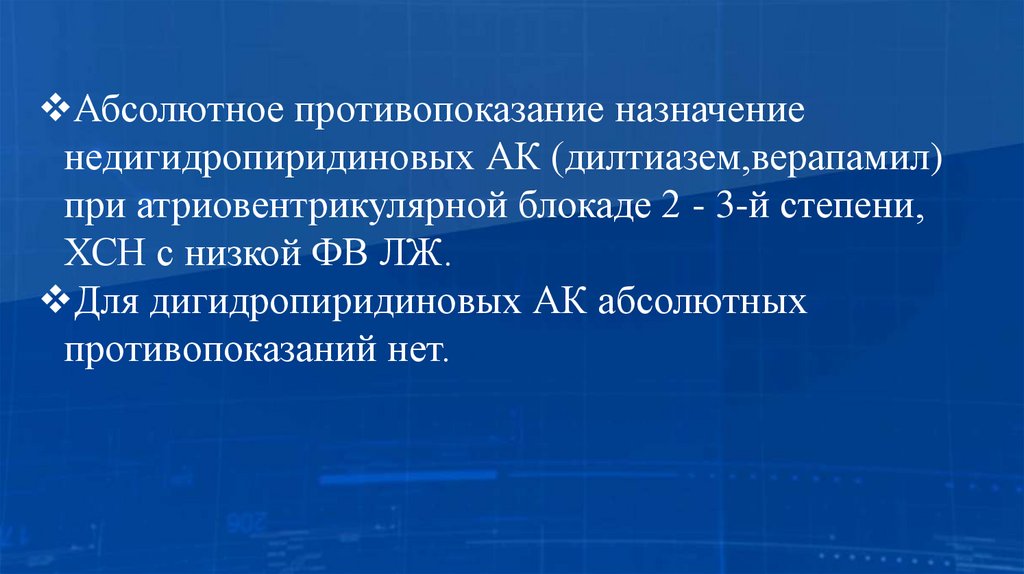 Абсолютное противопоказание назначениенедигидропиридиновых АК (дилтиазем,верапамил)