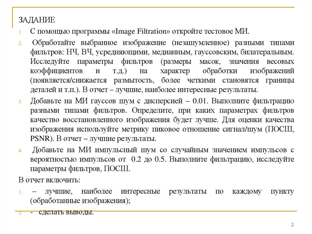 фильтров: НЧ, ВЧ, усредняющими, медианным, гауссовским, билатеральным.