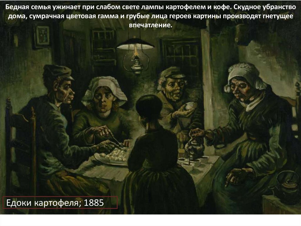 Бедная семья ужинает при слабом свете лампы картофелем и кофе. Скудное убранстводома, сумрачная цветовая гамма и грубые лица героев картины производят гнетущее