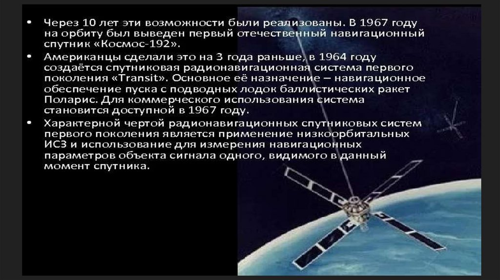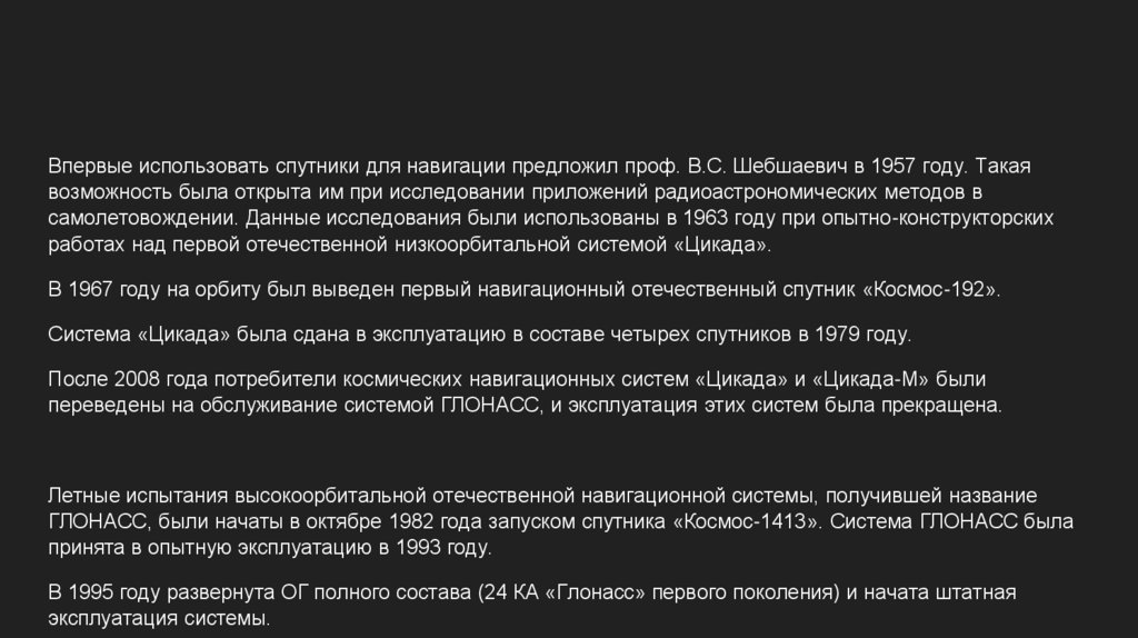 Впервые использовать спутники для навигации предложил проф. В.С. Шебшаевич в 1957 году. Такаявозможность была открыта им при исследовании приложений радиоастрономических методов в