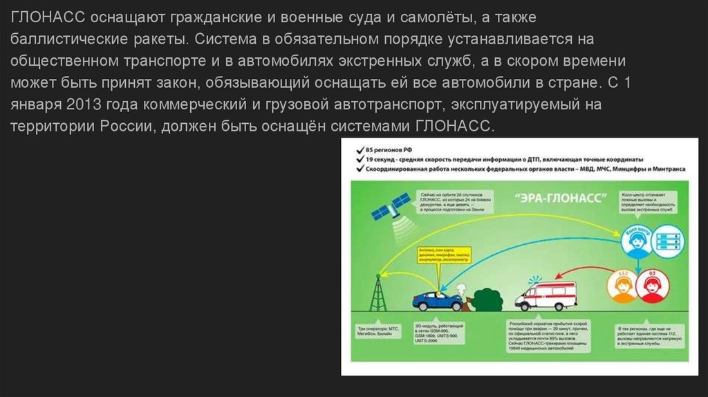 ГЛОНАСС оснащают гражданские и военные суда и самолёты, а такжебаллистические ракеты. Система в обязательном порядке устанавливается на