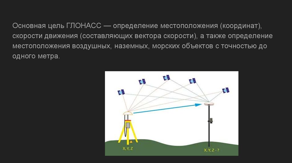 Основная цель ГЛОНАСС — определение местоположения (координат),скорости движения (составляющих вектора скорости), а также определение