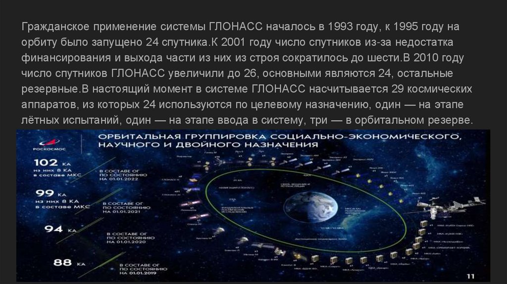 Гражданское применение системы ГЛОНАСС началось в 1993 году, к 1995 году наорбиту было запущено 24 спутника.К 2001 году число спутников из-за недостатка