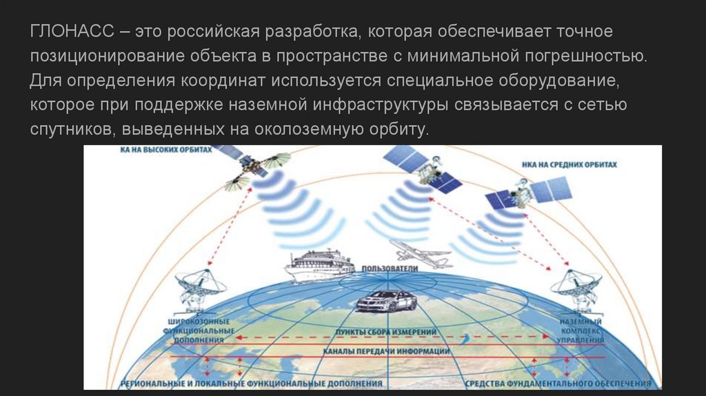 ГЛОНАСС – это российская разработка, которая обеспечивает точноепозиционирование объекта в пространстве с минимальной погрешностью.