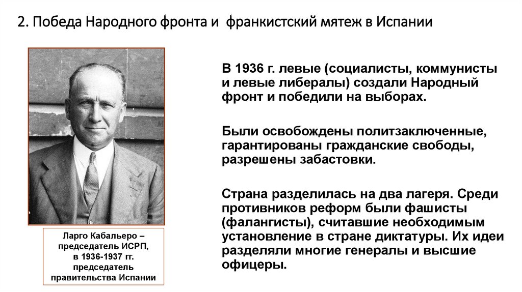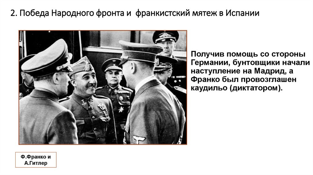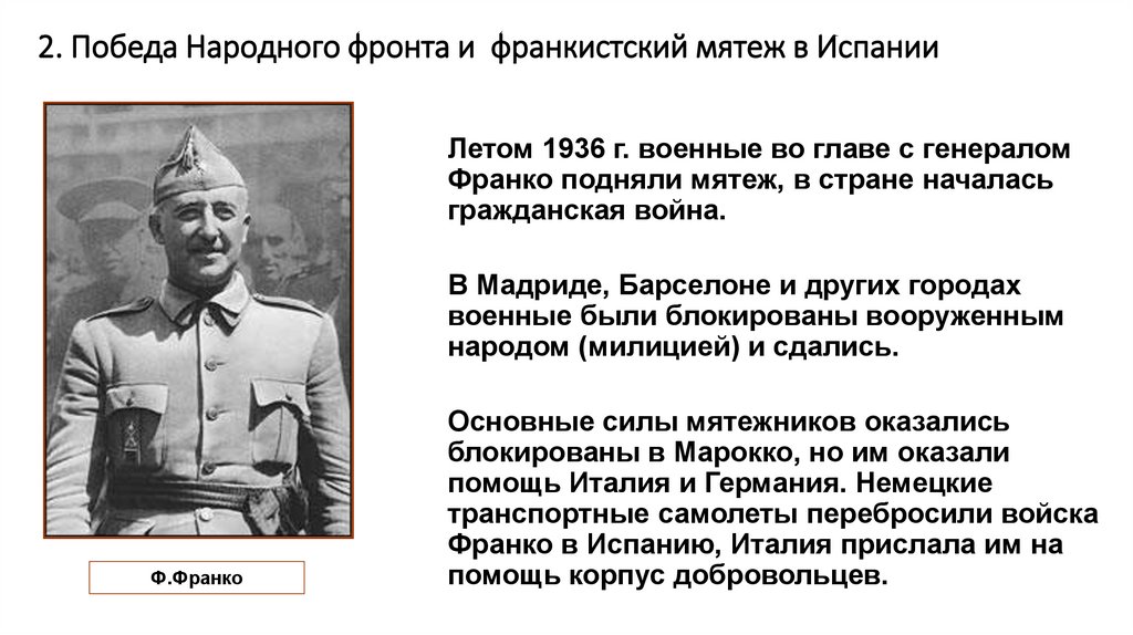 2. Победа Народного фронта и франкистский мятеж в ИспанииВ 1936 г. левые (социалисты, коммунисты