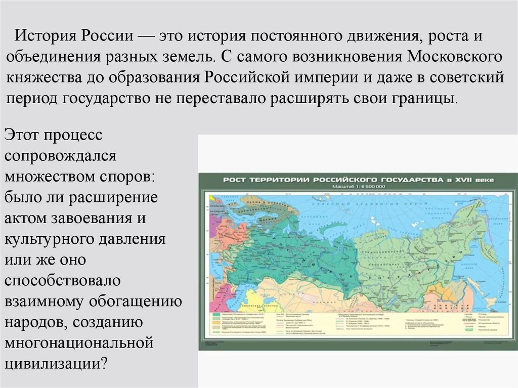 История России — это история постоянного движения, роста иобъединения разных земель. С самого возникновения Московского