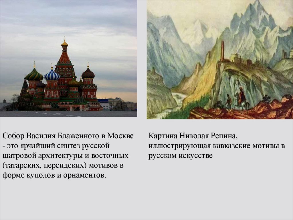 В архитектуре России можно увидеть татарские купола,кавказские орнаменты, сибирские мотивы из дерева