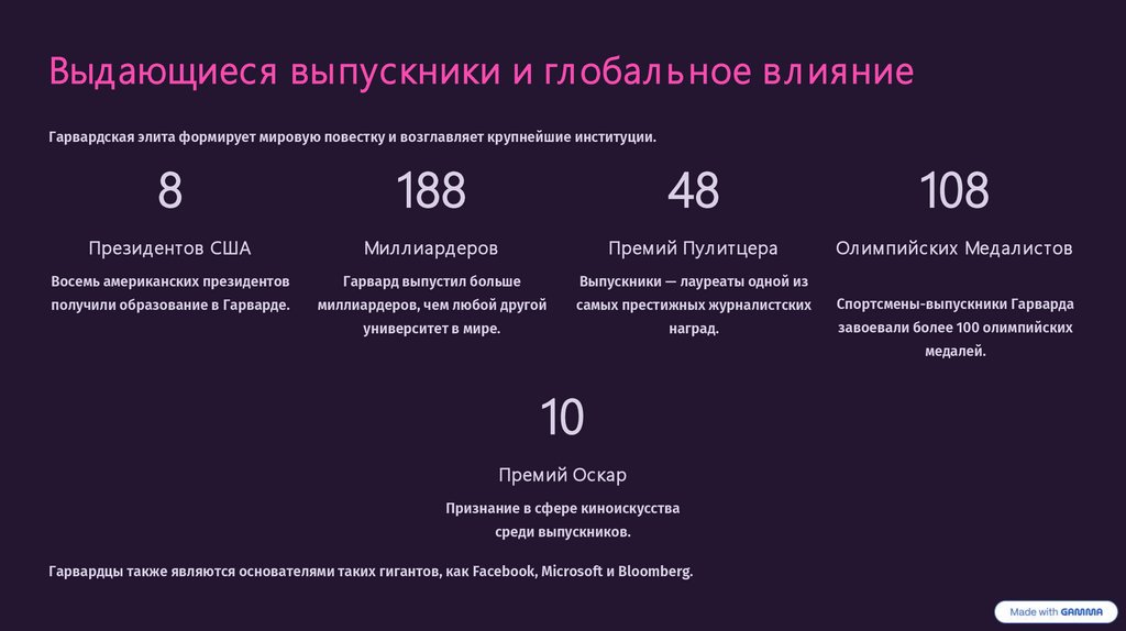 Выдающиеся выпускники и глобал ь ное вл ияниеГарвардская элита формирует мировую повестку и возглавляет крупнейшие институции.