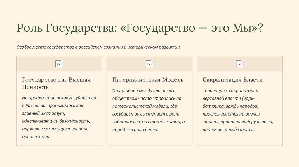 Роль Государства: «Государство — это Мы»?Особое место государства в российском сознании и историческом развитии.