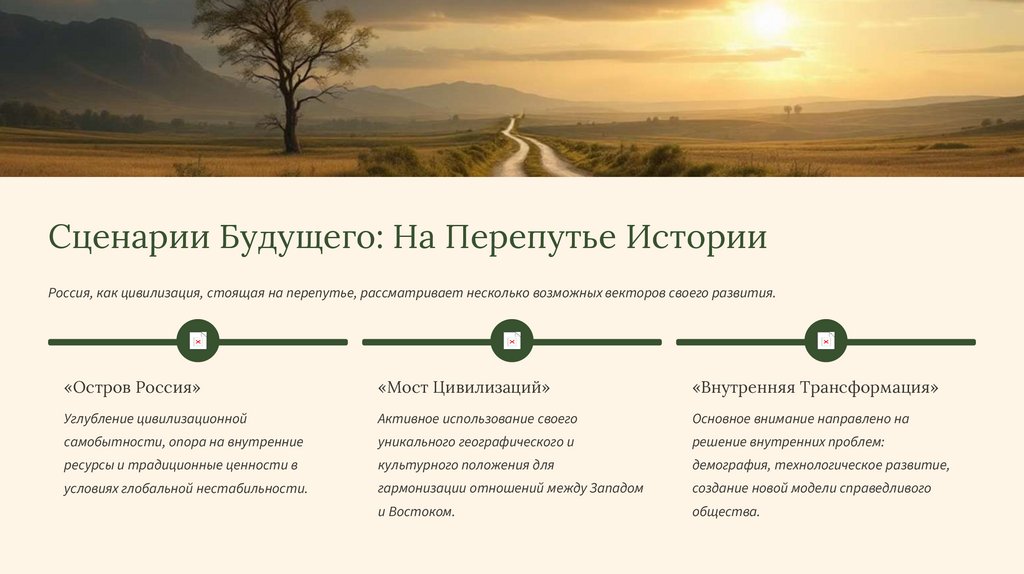 Сценарии Будущего: На Перепутье ИсторииРоссия, как цивилизация, стоящая на перепутье, рассматривает несколько возможных векторов своего развития.