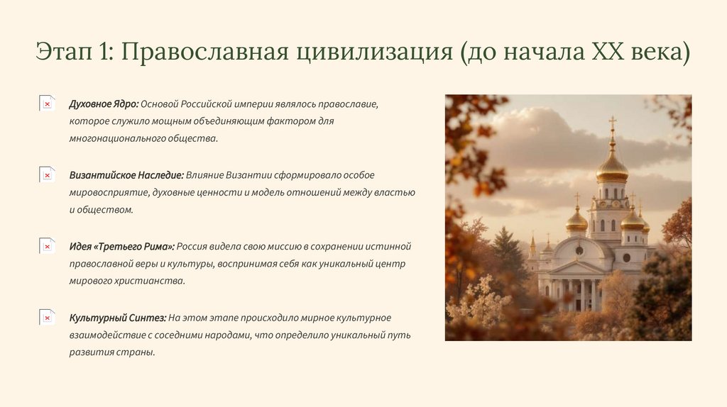 Этап 1: Православная цивилизация (до начала XX века)Духовное Ядро: Основой Российской империи являлось православие,
