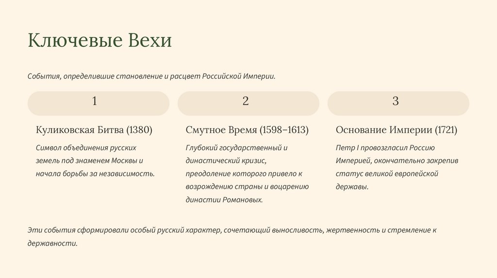 Ключевые ВехиСобытия, определившие становление и расцвет Российской Империи.