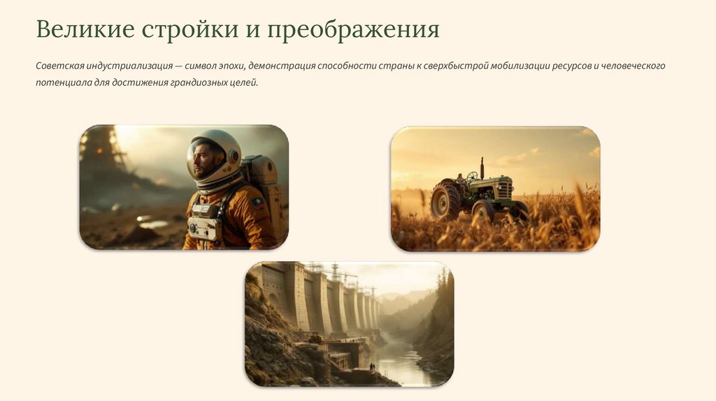Великие стройки и преображенияСоветская индустриализация — символ эпохи, демонстрация способности страны к сверхбыстрой мобилизации ресурсов и человеческого
