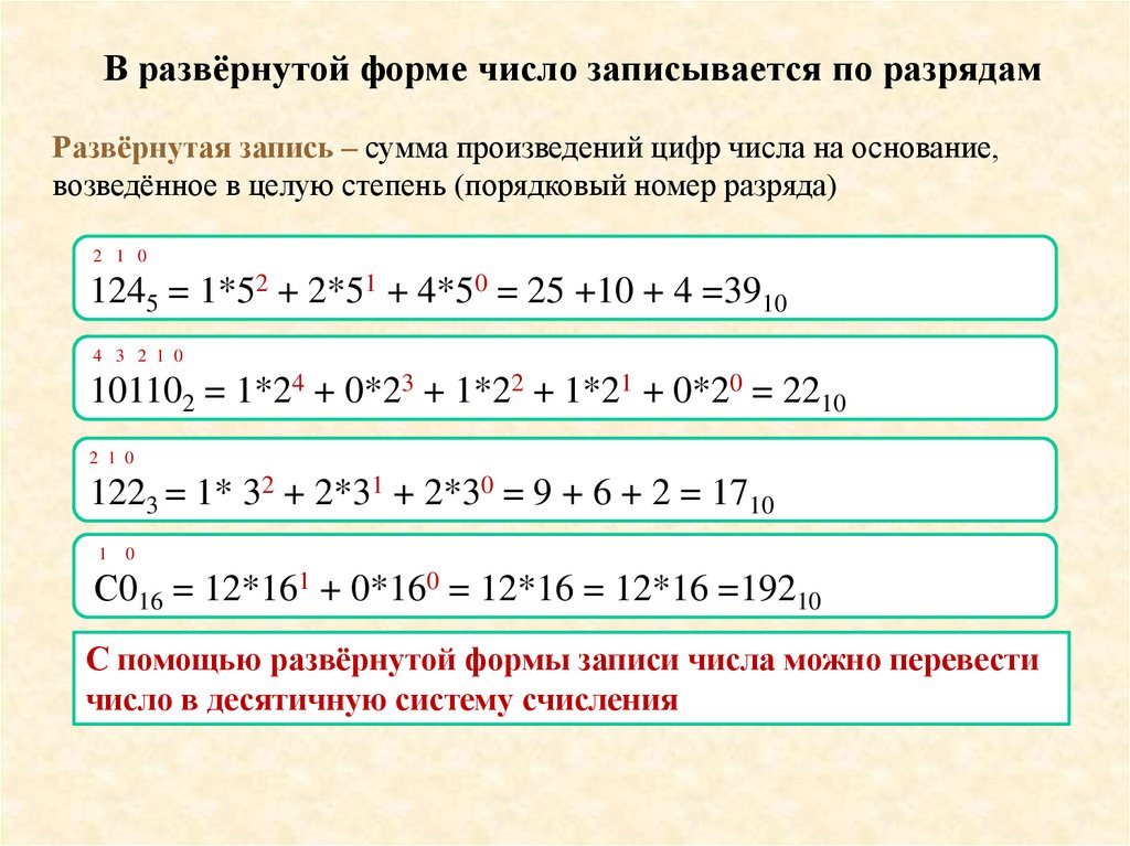 Развёрнутая запись – сумма произведений цифр числа на основание,