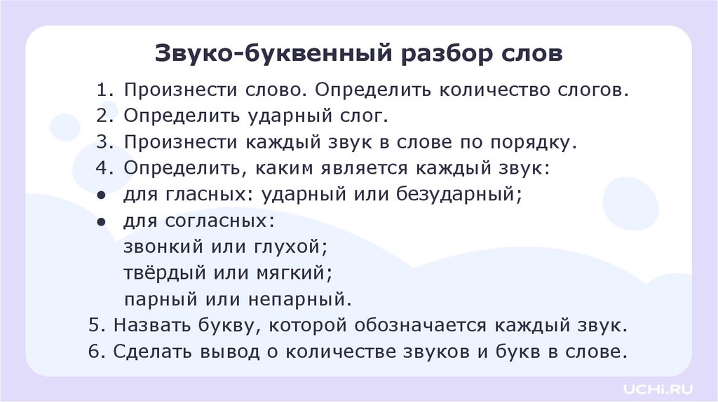 Звуко-буквенный разбор слов1. Произнести слово. Определить количество слогов.
