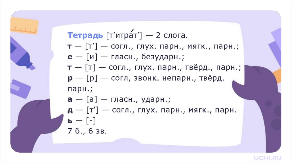 Тетрадь [т’итрат’] — 2 слога.т — [т’] — согл., глух. парн., мягк., парн.;
