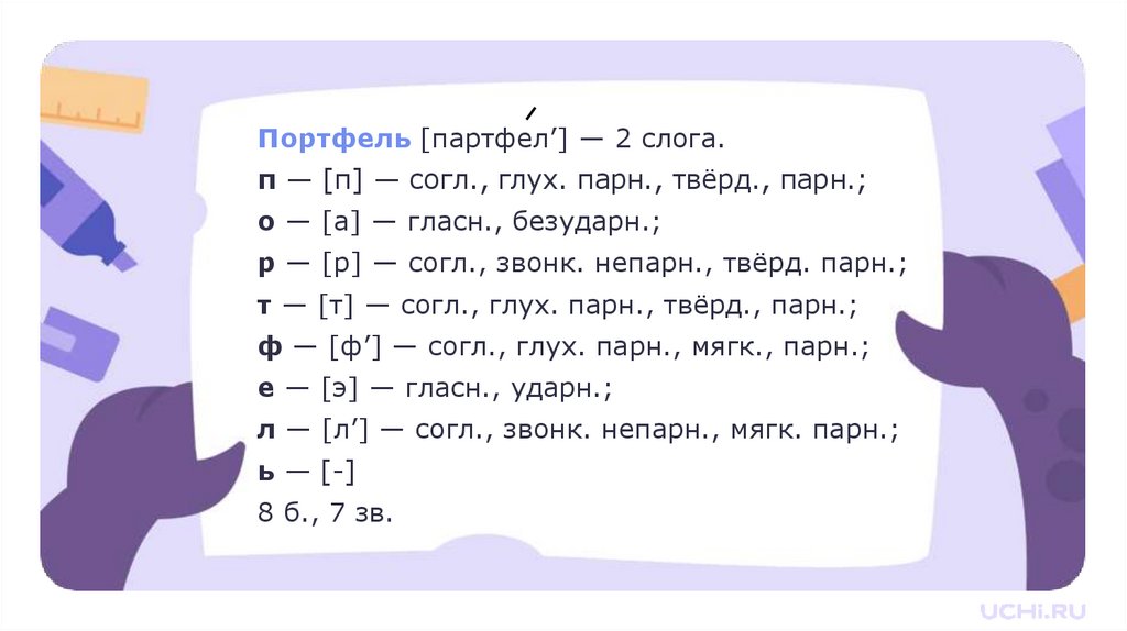 Портфель [партфел’] — 2 слога.п — [п] — согл., глух. парн., твёрд., парн.;