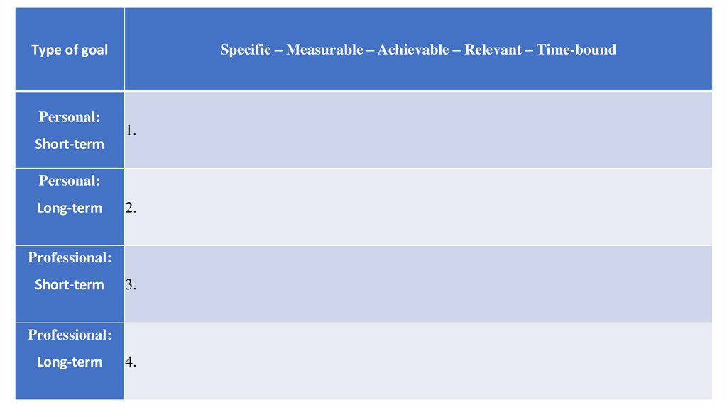 Specific – Measurable – Achievable – Relevant – Time-boundType of goal
