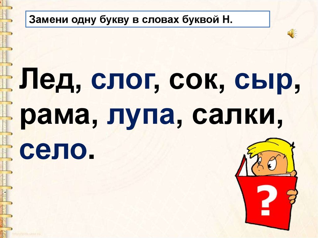 Замени одну букву в словах буквой Н.Лед, слог, сок, сыр,