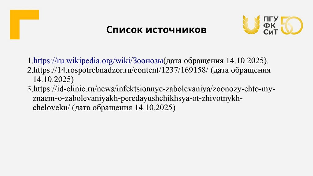 Список источников1.https://ru.wikipedia.org/wiki/Зоонозы(дата обращения 14.10.2025).