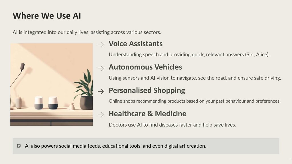Where We Use AIAI is integrated into our daily lives, assisting across various sectors.