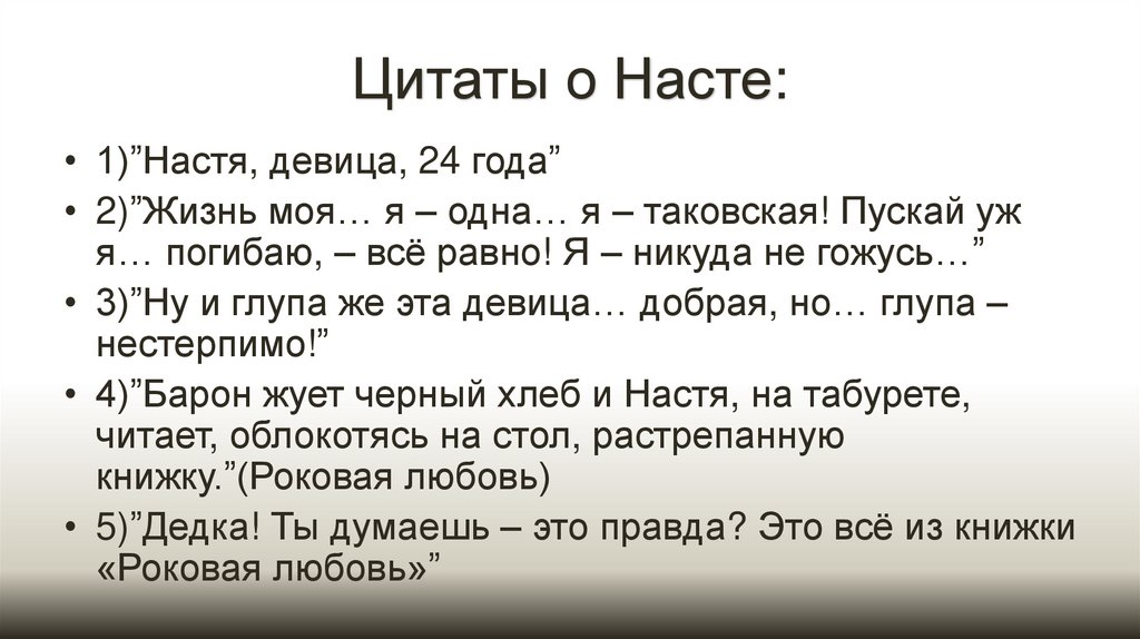 Цитаты о Насте:• 1)”Настя, девица, 24 года”