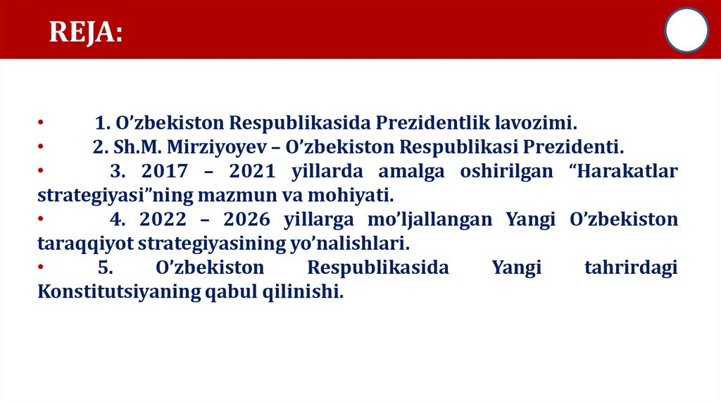 REJA:1. O’zbekiston Respublikasida Prezidentlik lavozimi.