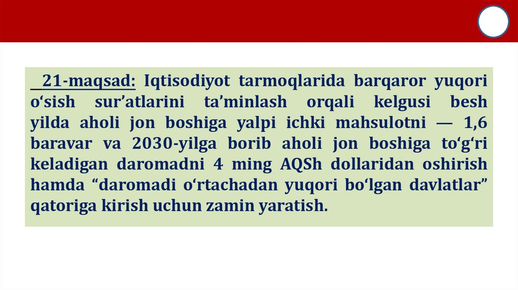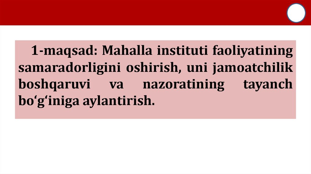 1-maqsad: Mahalla instituti faoliyatiningsamaradorligini oshirish, uni jamoatchilik