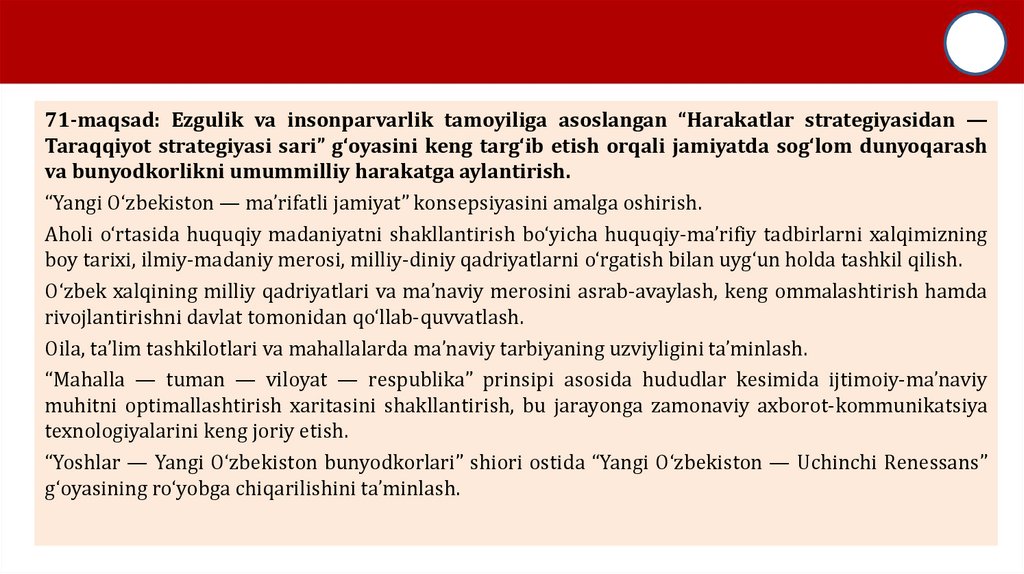 71-maqsad: Ezgulik va insonparvarlik tamoyiliga asoslangan “Harakatlar strategiyasidan —Taraqqiyot strategiyasi sari” g‘oyasini keng targ‘ib etish orqali jamiyatda sog‘lom dunyoqarash