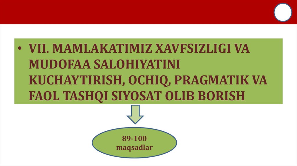 • VII. MAMLAKATIMIZ XAVFSIZLIGI VAMUDOFAA SALOHIYATINI