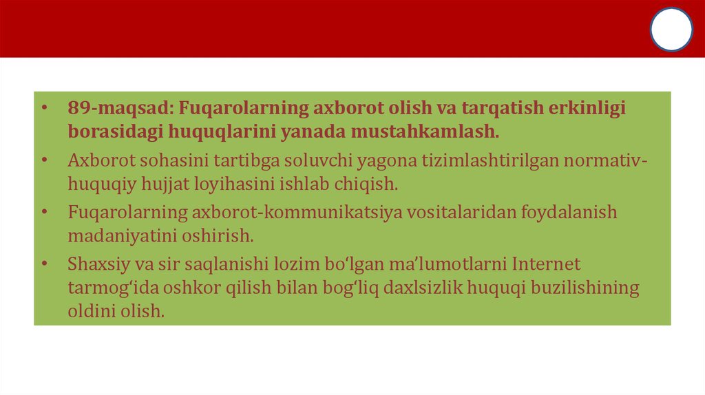 • 89-maqsad: Fuqarolarning axborot olish va tarqatish erkinligiborasidagi huquqlarini yanada mustahkamlash.