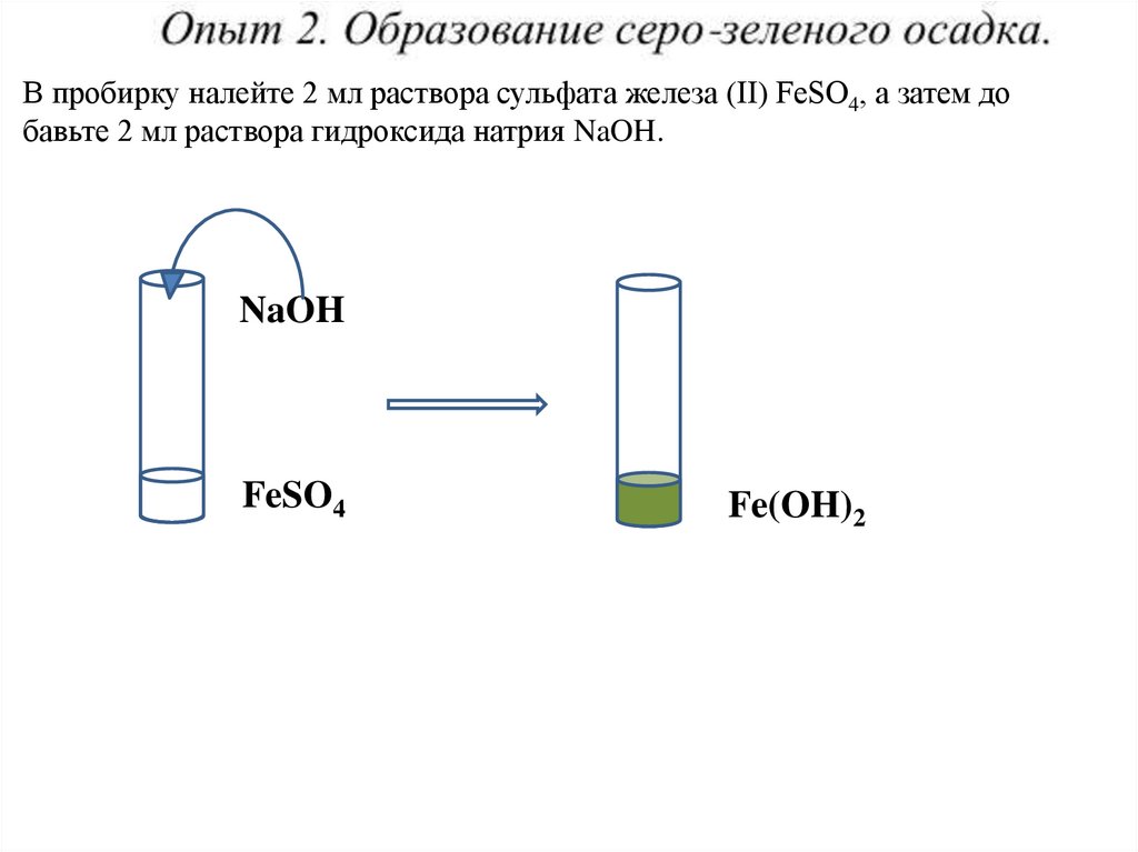 В пробирку налейте 2 мл раствора сульфата железа (II) FeSO4, а затем добавьте 2 мл раствора гидроксида натрия NaOH.