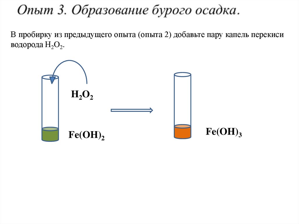 В пробирку из предыдущего опыта (опыта 2) добавьте пару капель перекисиводорода H2O2.