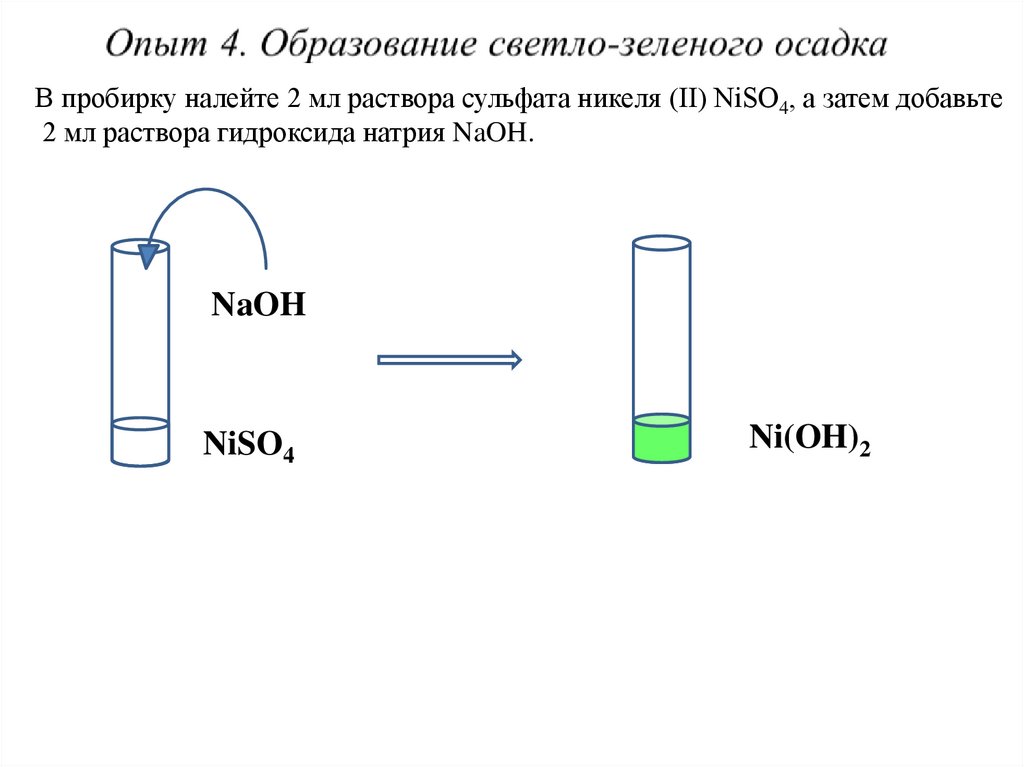 В пробирку налейте 2 мл раствора сульфата никеля (II) NiSO4, а затем добавьте2 мл раствора гидроксида натрия NaOH.