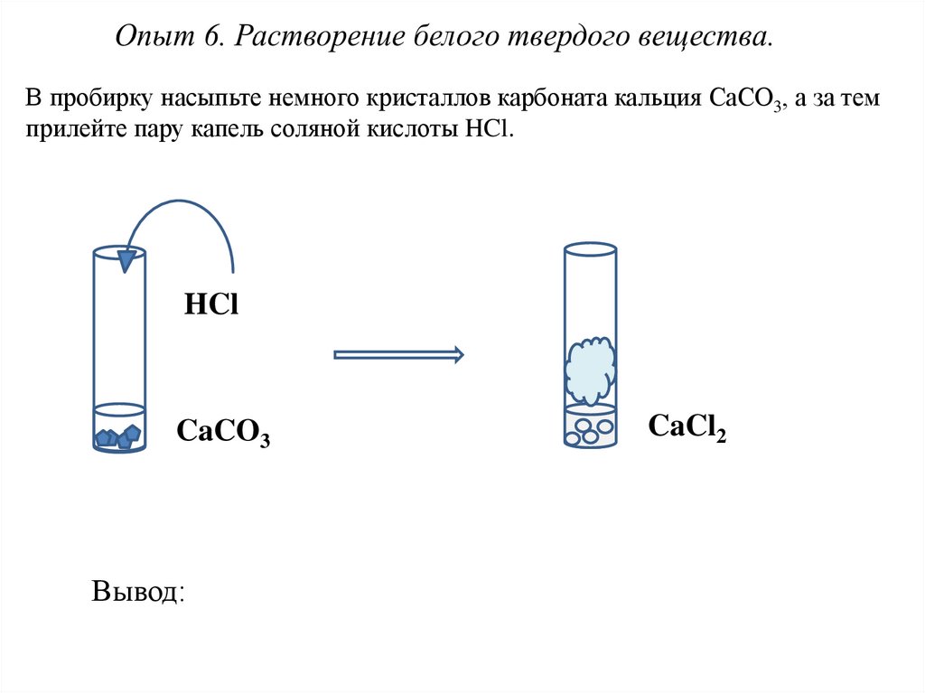 В пробирку насыпьте немного кристаллов карбоната кальция CaCO3, а за темприлейте пару капель соляной кислоты HCl.